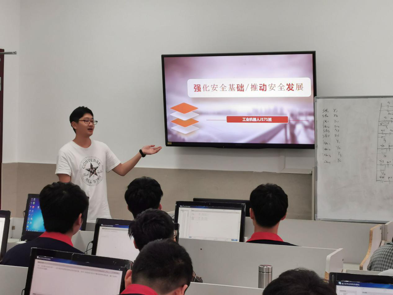 为了确保学生安全,切实增强学生的安全防范意识和避险能力,保障学生安全。上海工商职业技术学院机电工程系工业机器人J171班于2019年5月14日开展了以“安全教育”为主题的班会活动,本次活动由班级安全员杨逸华主持。