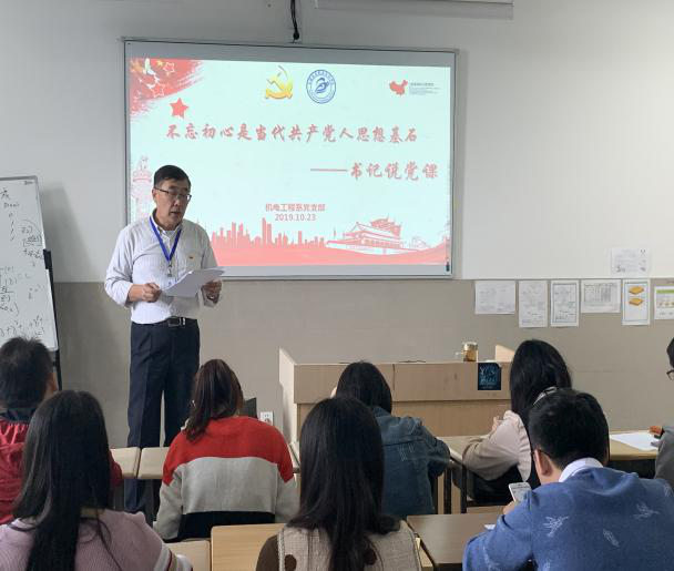 在10月23日下午12点10分,党支部召集全体党员在34号楼437教室进行一次“不忘初心,牢记使命”主题教育的党课,讲课之前,全体党员签订一份由党委纪委下发的“党风廉政建设承诺书”,支部要求全体党员签订完承诺书将另一份承诺书放在身边好好学习时常对照自身的言行。而后,丁书记向全体党员作了“不忘初心是当代共产党人思想基石”标题的党课。下午14:00组织全体党员观看“大医精诚,精于医术,诚于医德”学习“伟大工程”系列示范党课,机电系党支部除了召集全体党员,还特邀请系主任徐名聪老师,机电系副教授张爱红老师也一起观看了视频。此项视频极大地启迪和鼓舞了在场的年轻老师们。党课分“初心、责任、传承、使命”四个主题,围绕如何在新时代立德铸魂,对当代的动员进行教育。前辈们的业绩坚持社会主义方向,为党育人,为国育才,大力传承创新发展中医药事业的责任担当无不是我们学习继承的楷模。其间系主任视频中播放林其英老书记,王玉润老医师,刘嘉湘老前辈以自己一生的心血为人民谋健康,为振兴中医药和维护人民健康不懈努力,践行医护工作者的誓言,使更多的医护者受到极大的鼓舞。