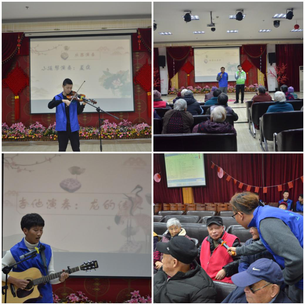 节目开始,首先两位主持人用本地方言跟在场的老人们打了招呼,紧接着由志愿者苏楷淇带来小提琴表演《夏夜》,随后是志愿者刘昂的吉他演奏《龙的传人》。