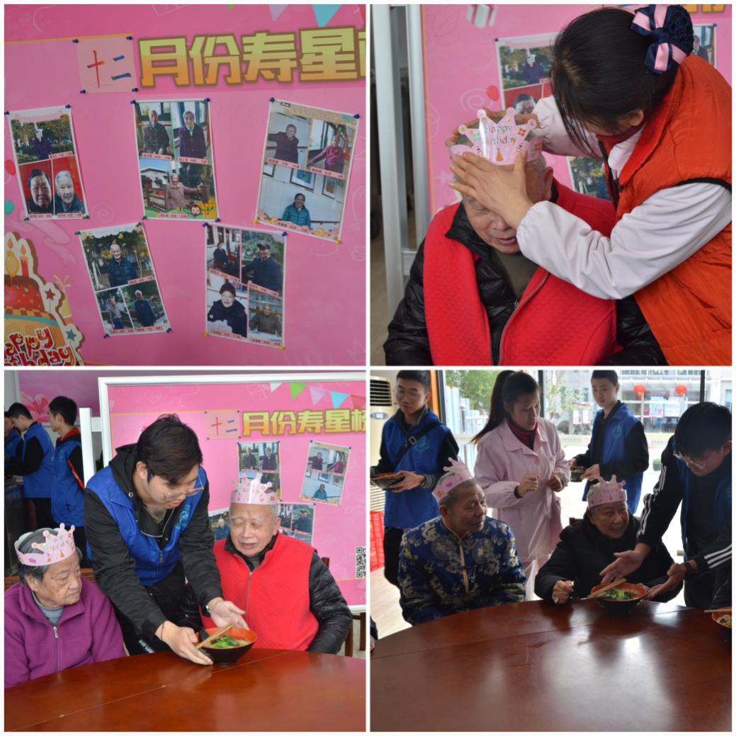 表演结束后,敬老院的工作人员强烈邀请志愿者们一起给12月份出生的老人们过生日。志愿者们为老人们戴上生日帽、端上长寿面,并祝福老人们身体健康,长命百岁!至此,本次敬老院活动圆满结束。