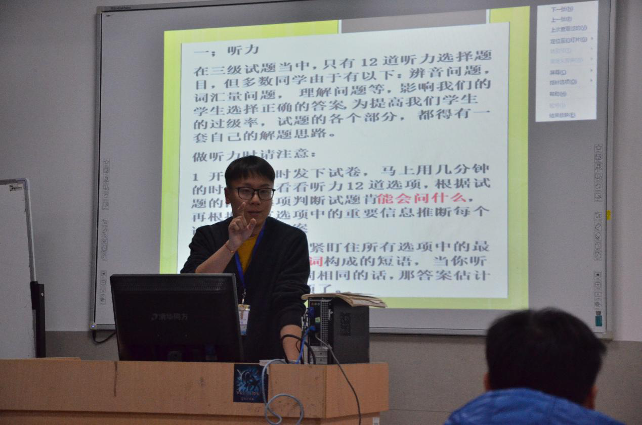 大学英语三级考试是每个大学生都必须经历的主要考试,是以后求职道路上的必备筹码。经过一年半的学习,2018级的同学们已经适应了大学的生活,并踌躇满志的积极准备英语三级考试积,但是在备考中也出现了许多困惑。为了帮助18级同学们解决备考中出现的问题,使他们更有成效的准备英语三级的考试,因此我校机电工程系团总支学生会本着“排学习之忧,解学生之难” 的宗旨,举办了此次有关英语三级考试的讲座。