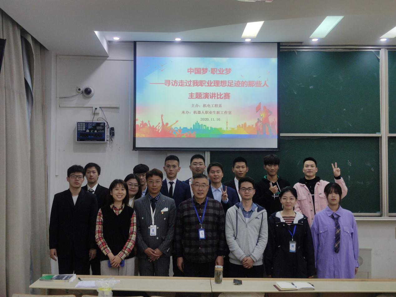 2020年11月16日下午四点半,于17号楼101举行“中国梦·职业梦”主题演讲比赛复赛。本次比赛由屠禾汐主持,作为评委出席本次活动的有:机电工程系党支部书记丁敏、机电工程系职业生涯工作室负责人宋淳正以及机电系辅导员汪金芝、史学伟、黄瑶和辅导员孙苗苗及部分学生到场观看了本次比赛。