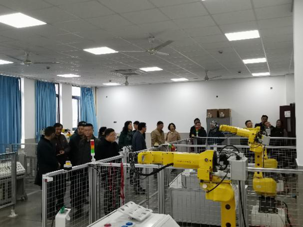 徐名聪主任带领各位领导前往机电工程系的数字化加工工艺实训基地,先后参观了生产型实训基地、数控i5智能机床实训中心、机器人实训中心及理实一体教室,并从设计理念、功能规模,环境设计和新技术的应用等四个方面详细介绍了机电工程系实训基地建设及发展情况。